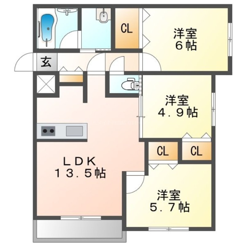| 間取り詳細 | LDK 13.5畳 、 洋室 4.9畳 、 洋室 5.7畳 、 洋室 6畳 |