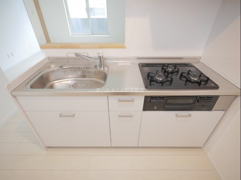 | 設備 | ガス(プロパン)、管理形態(巡回)、24時間緊急対応、インターホン(TVモニター付き)、火災報知機、専用ゴミ置き場(あり)、駐輪場、南向き部屋数(2室)、角部屋、デザイナーズ、フローリング、全居室フローリング、二重ガラス、照明器具、ベランダ・バルコニー、収納スペース、クローゼット、クローゼット数(3)、階段下収納、全居室収納、下駄箱、バス・トイレ別(別室)、シャワー、オートバス、脱衣所、給湯、ウォシュレット、洗面台、洗面所独立、シャンプードレッサー、洗面所にドア、洗濯機置き場(室内)、コンロ設置済、コンロ口数(2)、コンロ種類(プロパン)、グリル、システムキッチン、カウンターキッチン、対面キッチン、暖房のみ、暖房種類(ガス)、24H換気システム、地デジ(UHF)、光ファイバー | ||